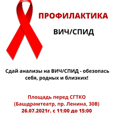 26 июля с 11-00 до 15-00 на площади перед Стерлитамакским театрально-концертным объединением (пр. Ленина, 30в) в рамках программы профилактики ВИЧ и СПИД будет работать передвижная медицинская станция, в которой можно будет сдать анализ на иммунные заболевания и получить консультацию специалиста. Тестирование проводится анонимно.