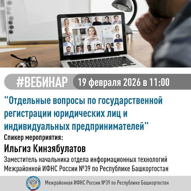 19 февраля в 11-00 Межрайонная ИФНС России № 39 по Республике Башкортостан (регистрирующий орган) проведёт вебинар.