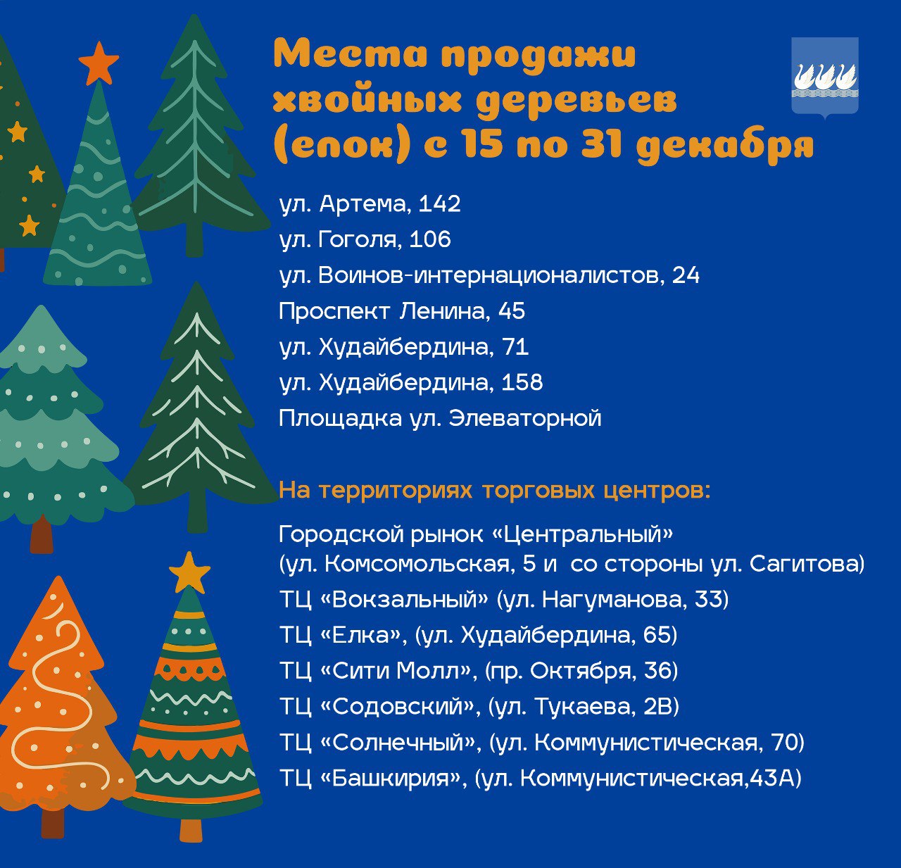 В Стерлитамаке ёлочные базары организованы на 14 площадках, в том числе возле торговых центров «Вокзальный», «Сити Молл», «Ёлка», «Солнечный», «Башкирия», «Содовский», «Центральный». Хвойные деревья будут продаваться по 31 декабря включительно.