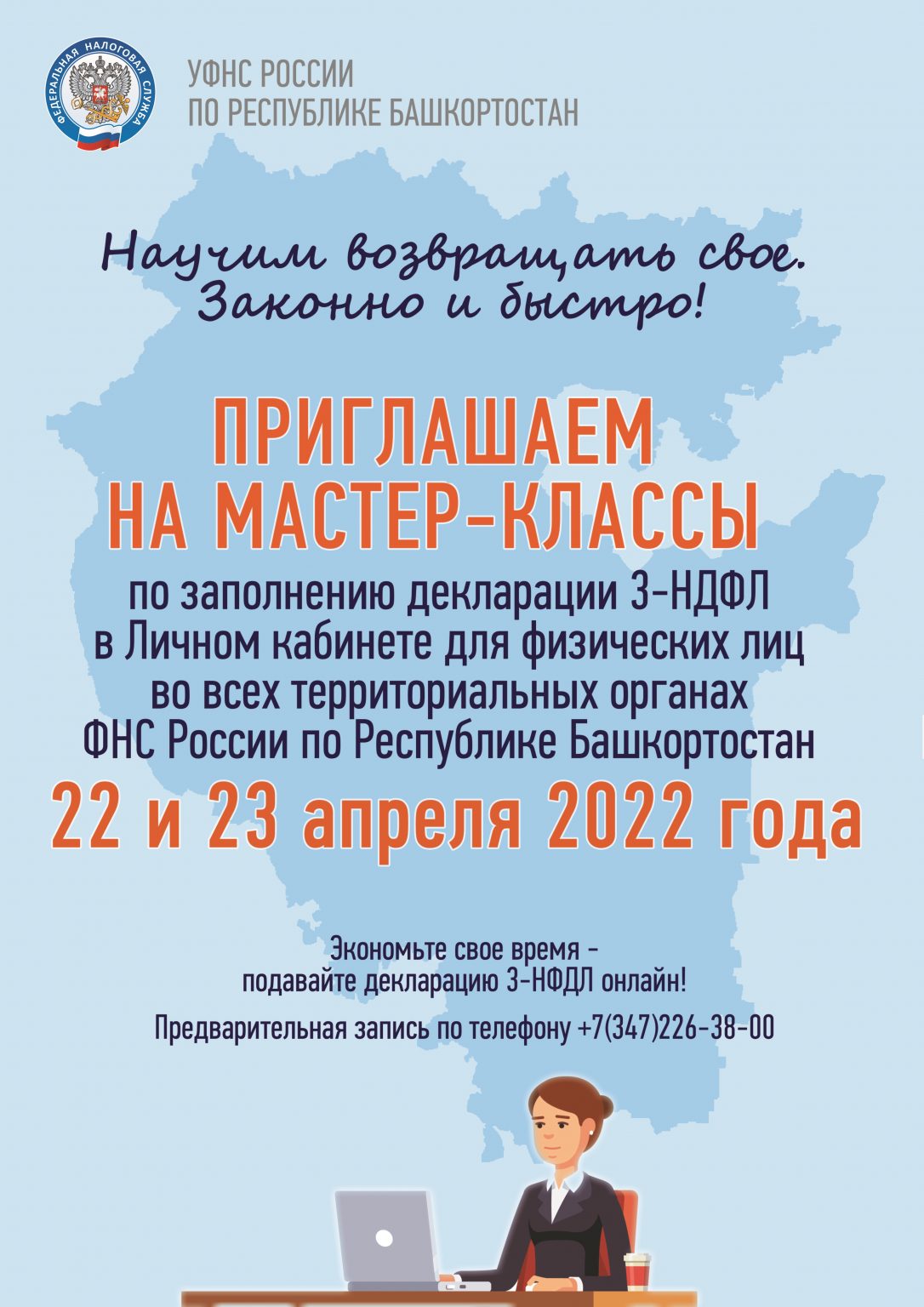 Налоговые органы Республики Башкортостан 22 и 23 апреля проведут очередной цикл открытых мастер-классов для налогоплательщиков по заполнению налоговых деклараций с помощью интерактивного сервиса «Личный кабинет для физических лиц» сайта ФНС России.