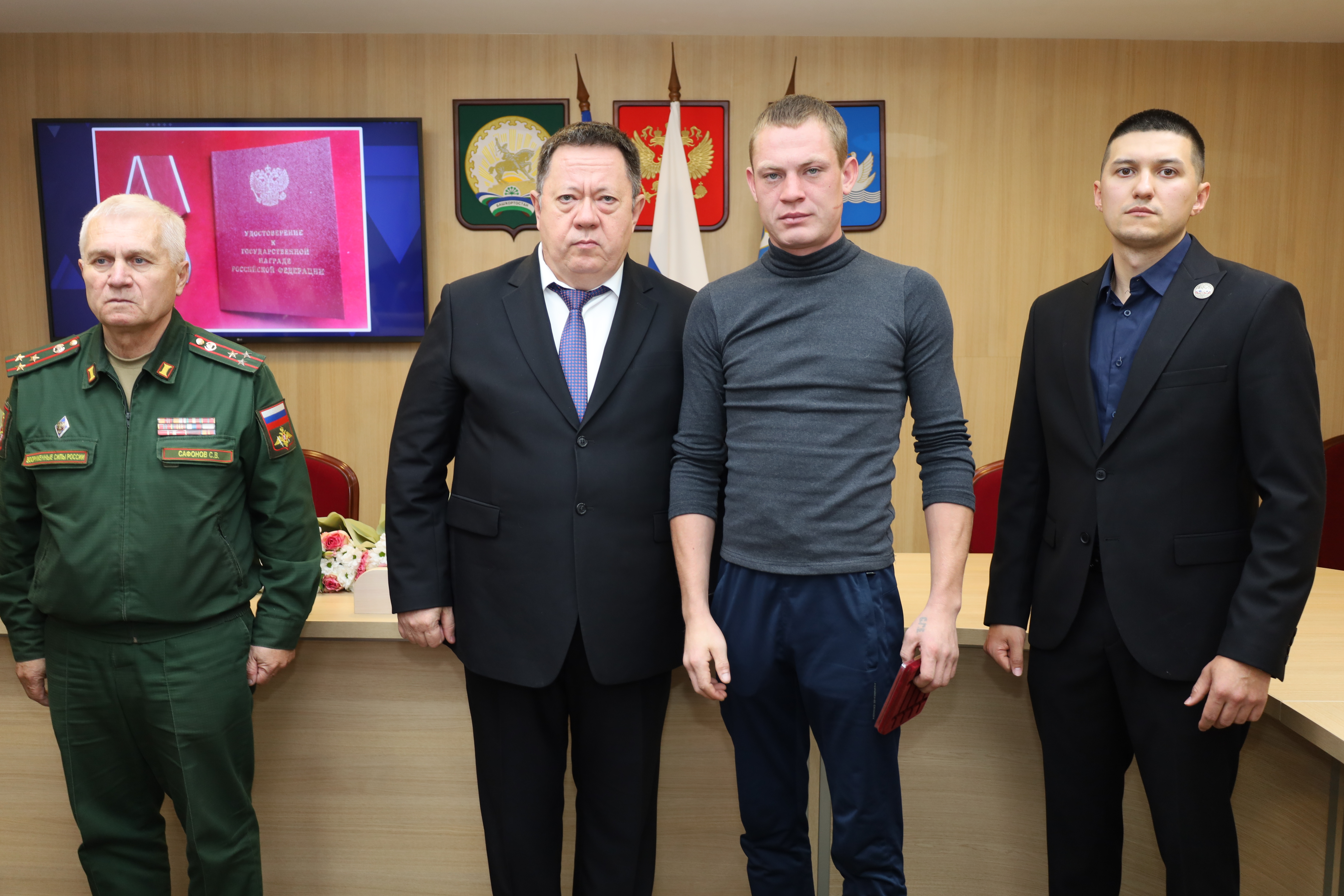 Первый заместитель главы администрации Стерлитамака Артур Разилевич Гафаров, военный комиссар города Стерлитамака и Стерлитамакского района Сергей Викторович Сафонов и участник программы «Герои Башкортостана» Данат Ринатович Бикташев передали посмертные награды близким родственникам павших героев.