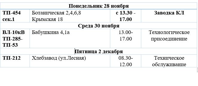 В связи с ремонтными работами с 28 ноября по 2 декабря планируется отключение электричества на некоторых улицах города.