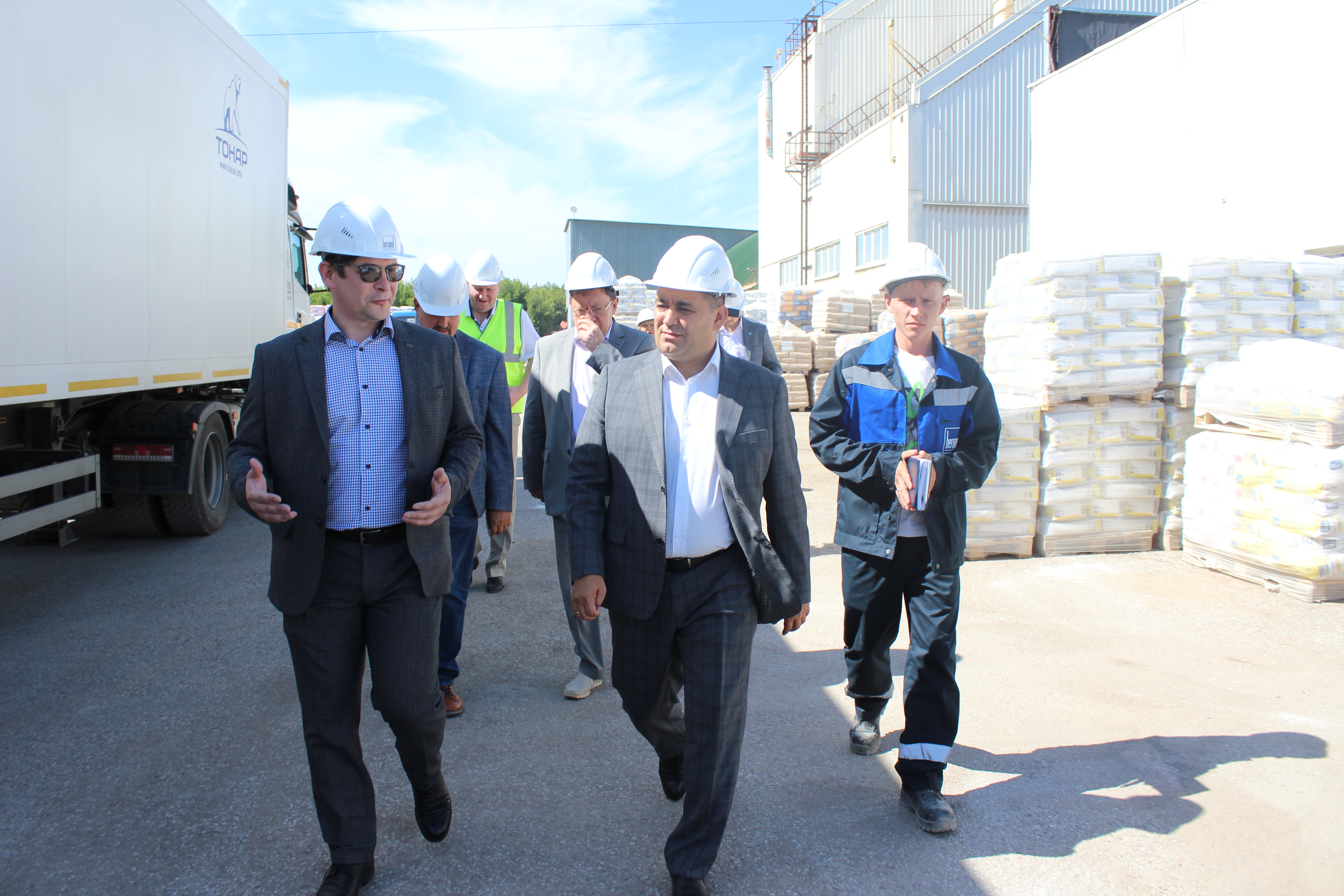 Сегодня глава администрации города Рустем Газизов, первый заместитель главы администрации Артур Гафаров и начальник отдела промышленности Владимир Егоров посетили компанию «Бергауф» и побывали на площадках по производству гипса, сухих смесей, лакокрасочной продукции, а также ознакомились с работой научно-исследовательского центра.